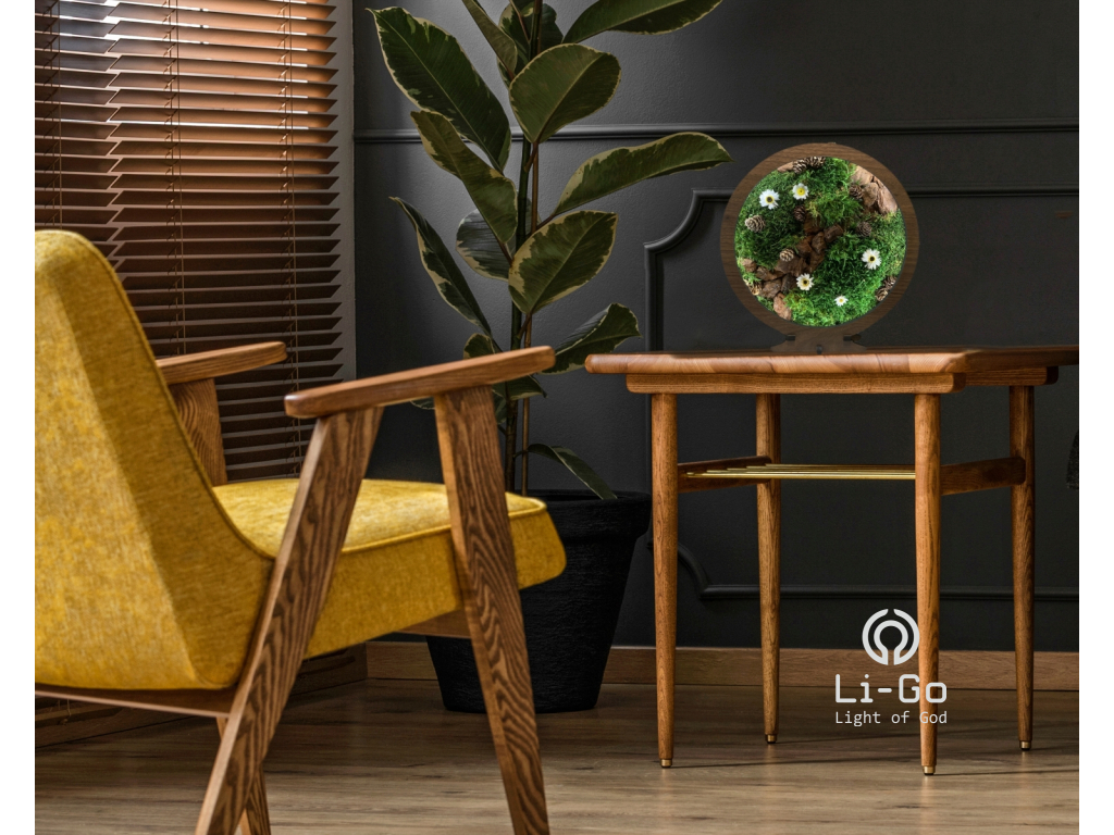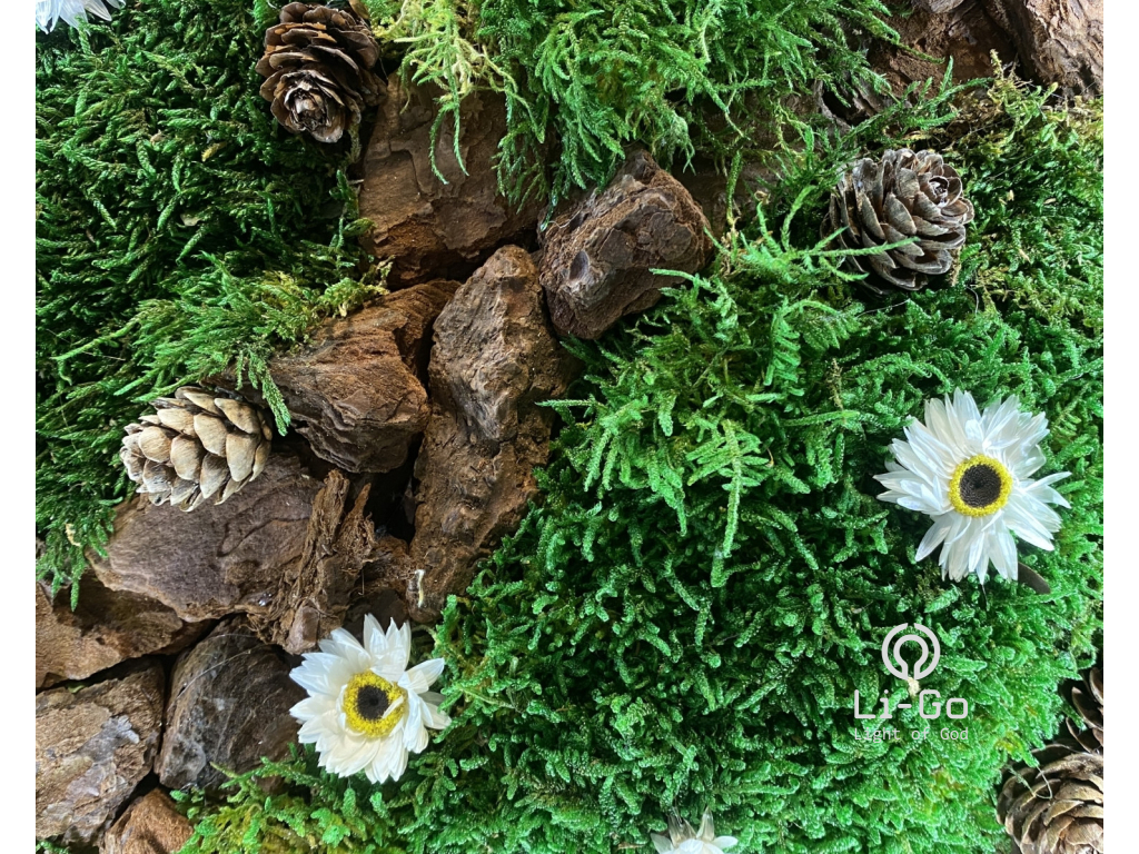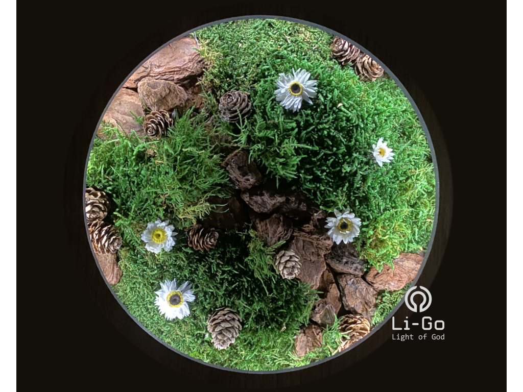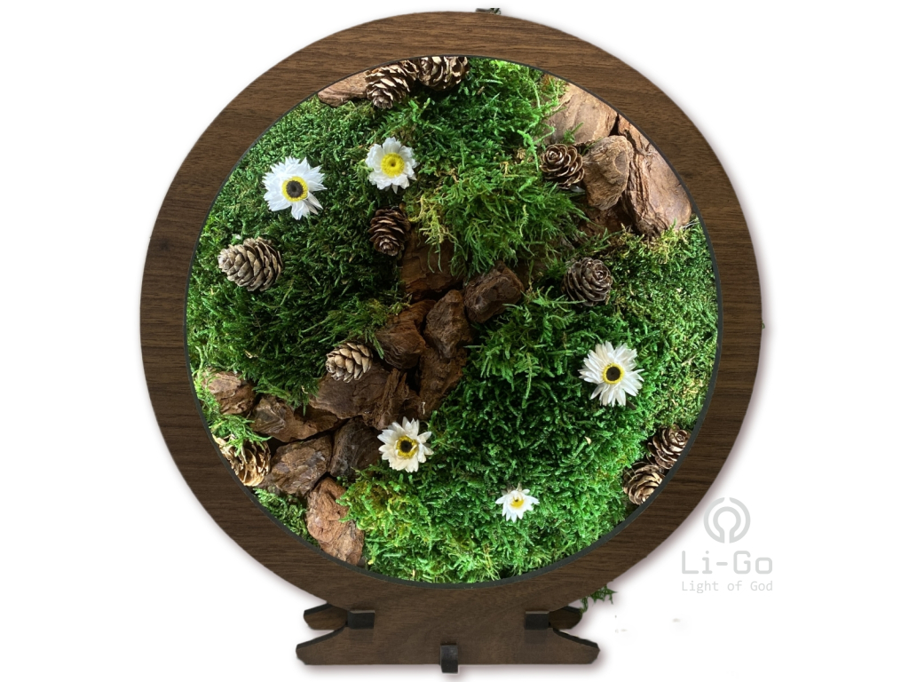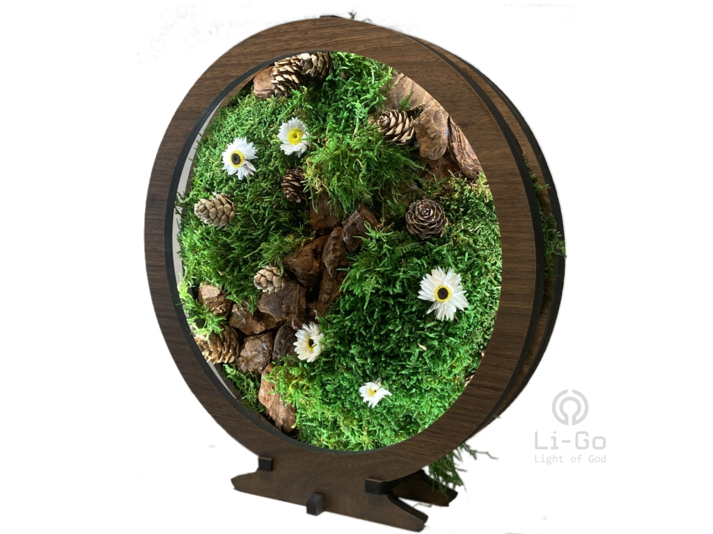 Obrazová LED lampa má podsvícenou vnitřní stěnu. Na lampu je přichycen mech, sušené květiny případně borová kůra a modřínové šišky. Lampa je osazena LED diodami a napájena externím zdrojem napětí na 12V do zásuvky. Součástí svítidla je otočný stmívač a zdroj.